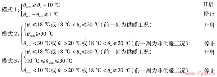 ③ 模式3:太陽能熱泵供暖。供暖過程中,當(dāng)太陽輻射較強(qiáng)時(shí),集熱器內(nèi)介質(zhì)的溫度不能滿足直接供暖的要求,但可以滿足熱泵供暖的要求。閥門7、11、14、9、4、1、12、15開啟,其余關(guān)閉。
