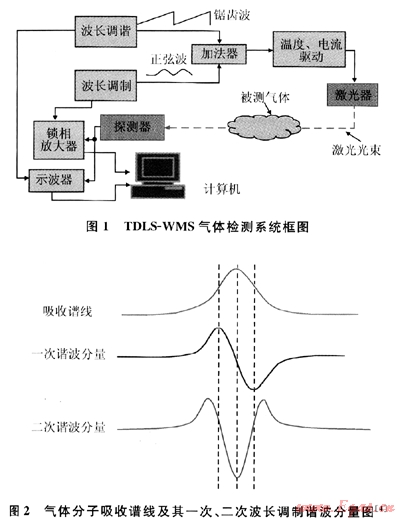技術(shù),其系統(tǒng)框圖見圖1。圖1中采用加法器將高頻正弦調(diào)制信號(hào)同低頻調(diào)諧信號(hào)結(jié)合起來,作為激光器的驅(qū)動(dòng)電流,在光電探測器將氣體吸收之后的光信號(hào)轉(zhuǎn)變?yōu)殡娦盘?hào)輸出并用鎖相放大器進(jìn)行相敏檢波,從而獲得被測氣體吸收譜線的諧波分量。圖2為氣體分子吸收譜線及其一次、二次波長調(diào)制諧波分量的示意圖。