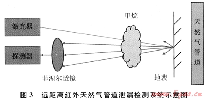 激光器輸出的1650nm的激光(甲烷氣體在1650nm附近存在強(qiáng)吸收譜線)經(jīng)過放大功率為1W的拉曼放大器放大后,照射在地表上,地表附近泄漏出的甲烷氣團(tuán)對激光吸收后,剩余的激光照射在陸地表面,經(jīng)反射、散射之后的激光再次通過甲烷氣團(tuán),然后通過一個(gè)大的菲涅爾透鏡會(huì)聚到光電探測器上。該系統(tǒng)在100~150m的探測范圍內(nèi)可以獲得71.4mg/m3的探測靈敏度,系統(tǒng)信噪比大于3[5]。能夠?qū)崿F(xiàn)復(fù)雜環(huán)境下天然氣輸送管道泄漏的高靈敏度檢測。英國蘇格蘭天然氣管道系統(tǒng)采用上述方法進(jìn)行天然氣泄漏檢測,但是此項(xiàng)技術(shù)目前在我國還沒有正式的應(yīng)用。