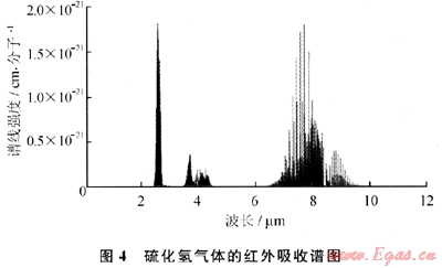 現(xiàn)有的硫化氫檢測多采用化學(xué)方法,需要將儀器放在硫化氫氣體中或者對環(huán)境中的氣體進(jìn)行采樣來分析其濃度,既無法保證實(shí)時(shí)監(jiān)測,同時(shí)威脅到檢測人員的安全。而遠(yuǎn)距離紅外甲烷檢測技術(shù)同樣可以用在對硫化氫的遠(yuǎn)距離實(shí)時(shí)探測上。從HITRAN 2008[1]氣體分子紅外吸收光譜數(shù)據(jù)庫可以知道,硫化氫在2.6μm和7.7μm附近有較強(qiáng)的吸收帶,在4μm處有相對較弱的吸收譜(圖4)。在空氣中檢測隨天然氣泄漏的硫化氫氣體,首先要克服空氣中的水蒸氣和殘余的甲烷氣體的干擾。水蒸氣在2.6μm處存在強(qiáng)吸收譜,同時(shí)甲烷在7.65μm也存在比硫化氫吸收強(qiáng)度大幾十倍的吸收譜線。