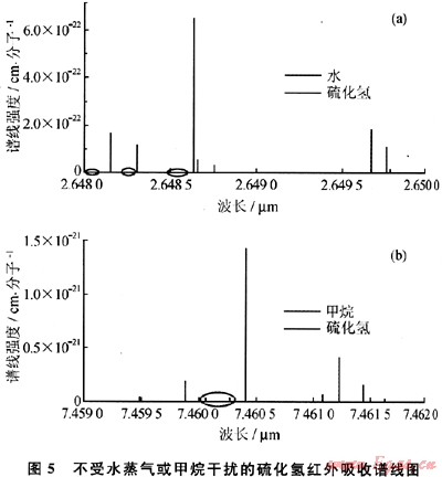 對泄漏在空氣中的硫化氫氣體進(jìn)行遠(yuǎn)距離檢測,空氣中殘留的甲烷、水蒸氣的干擾不可忽略。紅外光譜是分子振動(dòng)轉(zhuǎn)動(dòng)的特征譜線,不同分子因?yàn)榛瘜W(xué)鍵的不同,具有不同波長的吸收譜。同時(shí)氣體分子的吸收光譜并不是連續(xù)分布的,而是在一個(gè)波長范圍里離散的存在。譜線的寬度受到壓力的影響而有不同程度的展寬,在不同的壓力下具有高斯、Voigt或者洛倫茲分布。氣體分子的吸收譜線之間可以因?yàn)橄嘟嬖诮化B,或者由于分布較遠(yuǎn)而留有空白區(qū)。因此,通過詳細(xì)分析水蒸氣、甲烷、硫化氫氣體在不同波長下吸收譜線之間的交疊情況,來選擇不受或者受水蒸氣、甲烷吸收譜線影響較小的硫化氫吸收譜線,并以此來進(jìn)行檢測,從而確定出所要采用的光源波長、類型以及檢測方法等。圖5給出了根據(jù)HITRAN 2008分子光譜數(shù)據(jù)庫對硫化氫、水蒸氣和甲烷分子吸收譜線進(jìn)行分析之后選定的硫化氫吸收譜線,圈中的譜線為硫化氫吸收譜線附近的弱吸收強(qiáng)度的水蒸氣或甲烷吸收譜線。從圖5可以看出,硫化氫在2.64μm(圖5-a)和7.46μm(圖5-b)附近能夠得到不受水蒸氣或甲烷明顯干擾的吸收譜線,用來實(shí)現(xiàn)紅外硫化氫檢測。