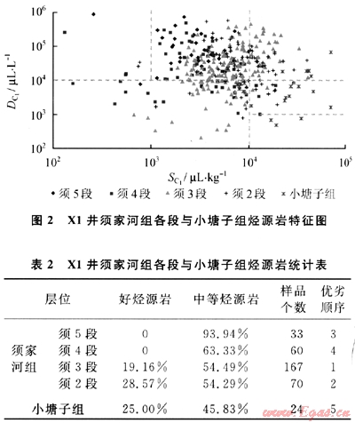據(jù)此X1井須5段烴源巖以C類為主;須4段以C類、B類為主;須3段以8類為主,少部分偏C類和A類;須2段以A類為主,少部分偏C類和B類;小塘子組以A類為主,見圖4(圖中SC2~5表示酸解烴重?zé)N含量)。