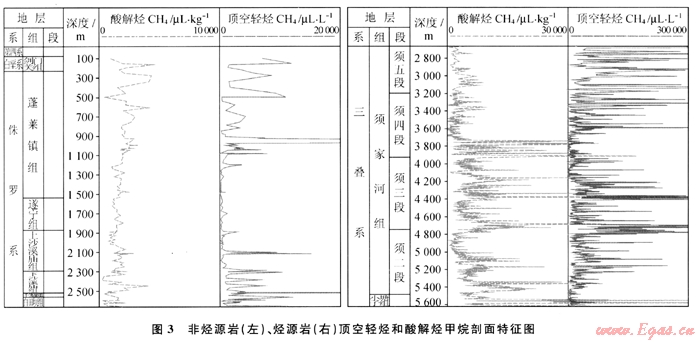 酸解烴所測(cè)的是歷史時(shí)期被礦物顆粒吸附和膠結(jié)物所捕獲的甲烷及其同系物,一般認(rèn)為其能夠反映歷史時(shí)期烴源巖的生烴特征和早期烴類大規(guī)模運(yùn)移特征,是歷史累積效應(yīng)的反映;而頂空輕烴所測(cè)是目前巖石礦物顆??紫?、裂縫中的甲烷及其同系物,反映的是現(xiàn)今地層含油氣特征及最近一期大規(guī)模運(yùn)移特征。
