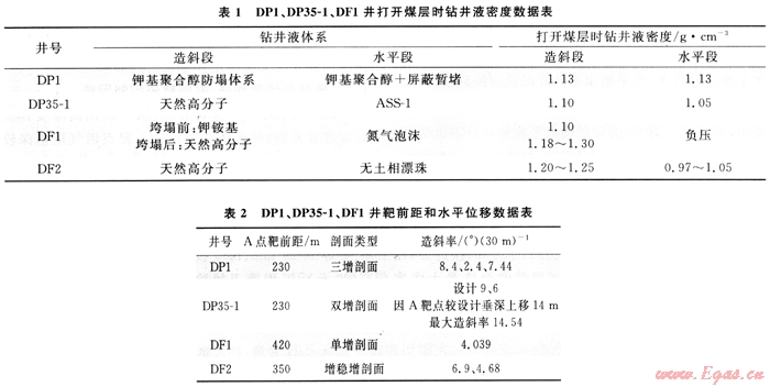 6) 調(diào)整了A點(diǎn)靶前距,有效降低DF2井鉆遇煤層段長(zhǎng)。造成DF1井兩次埋鉆事故原因主要有以下幾個(gè)方面:①打開煤層時(shí)鉆井液密度不足以平衡煤層的垮塌應(yīng)力(表1為DP1井、DP35-1、DF1打開煤層時(shí)鉆井液密度數(shù)據(jù));②DF1造斜段煤層垮塌時(shí)采用倒裝鉆具組合,滑動(dòng)鉆進(jìn)后變復(fù)合鉆進(jìn)時(shí),由于鉆具撓動(dòng)敲打,誘發(fā)煤層大量坍塌,造成突然坍塌埋鉆;③DF1井為長(zhǎng)半徑水平井,A點(diǎn)靶前位移大,造斜率小,穿越煤層段長(zhǎng),累計(jì)煤層厚43m,單層最大厚度為25m(表2為DP1井、DP35-1、DF1、DF2井造斜段造斜率數(shù)據(jù))。