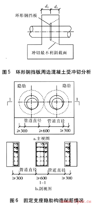 ② 管道穿過(guò)固定支座處,由于管道上環(huán)形鋼擋板對(duì)混凝土產(chǎn)生局部壓應(yīng)力,宜在孔邊加設(shè)隱肋[5],且隱肋內(nèi)的鋼筋總截面積不宜小于被切斷鋼筋截面積的1.5倍,并應(yīng)配置箍筋,見圖6,圖中數(shù)值單位為mm。