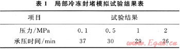 管道局部封堵的原理是通過向管道中放入具有一定強度的封堵物,利用其與管道壁面之間的摩擦力或結(jié)合力來實現(xiàn)局部封堵,皮囊封堵與機械封堵均屬于這一范疇。局部冷凍封堵通常是將管道中可凍結(jié)的流體冷凍,通過冷凍段來承受壓力,起到隔離的作用。小管徑天然氣管道要采用冷凍封堵,必須先注入可凍結(jié)流體(常用的可凍結(jié)流體是水),再進行冷凍。為了驗證水變成冰后自身的承壓能力以及與管壁的結(jié)合力能否承受較高的氣壓,筆者在Φ60mm×8mm的試驗管道內(nèi)密封一段長100mm水柱,將試驗管道放于冰柜中進行冷凍,使水凍成冰,再在室溫(15℃)下加氣壓,進行局部冷凍封堵模擬試驗,試驗結(jié)果見表1。