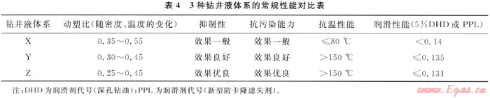 在綜合調(diào)研國(guó)內(nèi)外深井鉆井液體系的基礎(chǔ)上,結(jié)合川西地區(qū)深井的工程地質(zhì)特征及鉆井液的現(xiàn)場(chǎng)應(yīng)用情況,選擇在川西地區(qū)應(yīng)用比較成功的X、Y和Z等3種鉆井液體系進(jìn)行室內(nèi)評(píng)價(jià),根據(jù)配方進(jìn)行配制的鉆井液,對(duì)其流變性、抑制性、潤(rùn)滑性及抗溫、抗鹽膏能力進(jìn)行了系統(tǒng)的評(píng)價(jià)(表4)。結(jié)果表明,3種鉆井液體系具有各自的特點(diǎn)和適用范圍,X鉆井液屬于不分散鉆井液體系,對(duì)提高鉆井速度很有幫助,但是其在耐溫性和固相容量限兩個(gè)方面存在問(wèn)題。當(dāng)?shù)貙訙囟瘸^(guò)80℃時(shí),X鉆井液體系的性能開始惡化,穩(wěn)定性變差,失水量增加;而當(dāng)鉆井液密度過(guò)高時(shí),由于受到X鉆井液容量限的限制,鉆井液性能會(huì)整體變差。因此,X鉆井液體系只適應(yīng)于淺井段的鉆井。