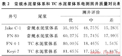 TC柔性水泥漿體系在蘇丹6區(qū)7口井的Φ244.5mm中間套管固井中得到了成功應(yīng)用,聲波測井結(jié)果為:優(yōu)質(zhì)率平均提高30%以上,不合格率平均下降了15%。表2是蘇丹6區(qū)采用常規(guī)水泥漿體系和TC水泥漿體系封固Φ244.5mm套管的固井質(zhì)量對比結(jié)果,分別取自各井完井前CBL電測評價(jià)資料,數(shù)據(jù)顯示應(yīng)用TC柔性水泥漿體系后固井質(zhì)量顯著提升。