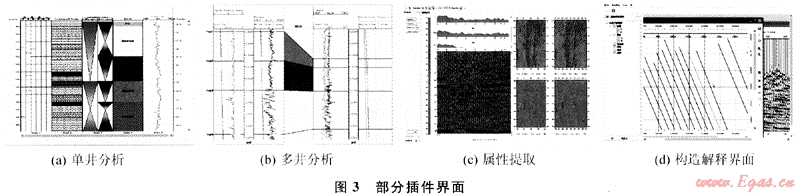 井分析插件包括合成記錄、地質(zhì)層位標(biāo)定、AVO分析、流體替換、交會分析等單井分析以及地層對比、砂體對比分析等多井分析功能。構(gòu)造解釋插件主要包括速度場構(gòu)建、2D/3D構(gòu)造解釋、全三維可視化解釋、時深轉(zhuǎn)換等。屬性儲層預(yù)測插件包括常規(guī)屬性及特殊屬性提取、屬性優(yōu)化、儲層預(yù)測。地質(zhì)繪圖插件包括數(shù)據(jù)網(wǎng)格化、等值線繪制、構(gòu)造成圖等功能。圖3為插件的部分界面。