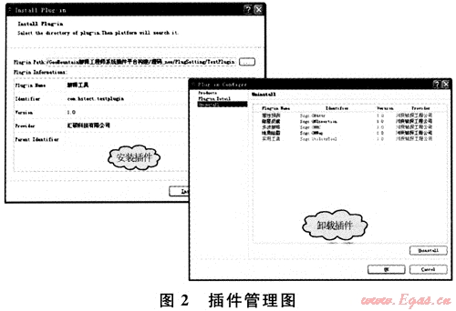 插件平臺是整個系統(tǒng)的核心,是功能插件實現(xiàn)的基礎(chǔ)。插件平臺包含重要的核心組件,分別有運行時核心、工作臺GUI、項目管理、幫助系統(tǒng)數(shù)據(jù)管理和平臺數(shù)據(jù)業(yè)務(wù)等。插件平臺不包含具體的功能實現(xiàn),只為功能插件提供運行環(huán)境、實現(xiàn)接口及數(shù)據(jù)管理,而插件實現(xiàn)其業(yè)務(wù)功能要依賴平臺接口。插件通過平臺安裝的方式安裝入平臺中,同時平臺也提供插件管理功能,如卸載插件等(圖2)??梢院芎玫亟鉀Q軟件開發(fā)與集成問題,適用高級版和低級版的軟件安裝,這對程序組織開發(fā)十分方便。軟件系統(tǒng)采用C++語言的跨平臺GUI工具包QT開發(fā)[2~3],可運行于Windows、Linux、Unix等多個平臺之上。