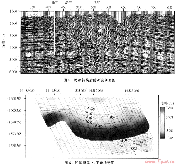 GeoMountain解釋軟件系統(tǒng)在10多個項目中得到了廣泛應(yīng)用,取得較好效果。圖4為西部某工區(qū)構(gòu)建的地下速度模型,經(jīng)時深轉(zhuǎn)換后得到深度剖面。由于準(zhǔn)確的速度場構(gòu)建,消除了時間剖面的構(gòu)造假象,恢復(fù)了地下復(fù)雜構(gòu)造的真實形態(tài)(圖5)。圖6為某層的逆掩斷層構(gòu)造成圖,它同時刻畫了斷層上、下盤包括逆掩部分的構(gòu)造形態(tài)。