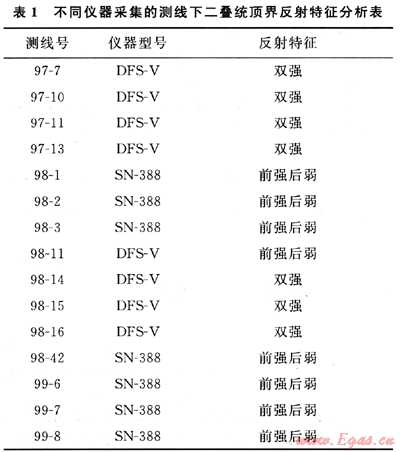 表1列出了不同年度、不同儀器采集的部分二維疊加剖面下二疊統(tǒng)頂界反射特征。從表1中看出:SN-388采集的大多數(shù)測(cè)線陽新統(tǒng)頂界反射特征為前強(qiáng)后弱的單強(qiáng)相位,與三維剖面下二疊統(tǒng)頂界反射為單強(qiáng)相位特征相近。而DFS-V數(shù)字地震儀采集的大多數(shù)測(cè)線下二疊統(tǒng)頂界反射特征為雙強(qiáng)相位。由此得出:DFS-V儀器采集的二維資料與三維資料特征不一致,反射特征差異是由儀器響應(yīng)的不同而引起的。