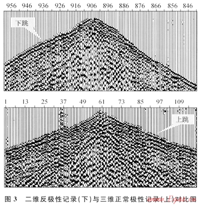 將二維單炮記錄反極性后與三維記錄對(duì)比,其反射特征與三維記錄特征接近,但初至明顯為上跳(圖3),這說明二維單炮記錄采集時(shí)的極性是正確的。