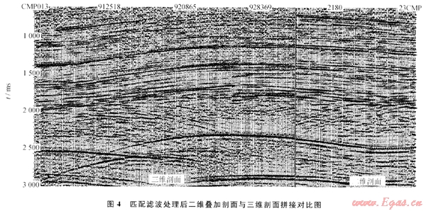 通過以上分析,認(rèn)為WBC構(gòu)造二維資料與三維資料特征差異的主要原因是由于不同儀器接收的原始記錄不同造成。采用反極性處理和匹配濾波處理兩種方式對(duì)二維剖面進(jìn)行相位調(diào)整,其特征與三維剖面均相近,但反極性處理存在約20ms的時(shí)差,且相位相反。匹配濾波處理無此現(xiàn)象,但是匹配濾波處理也有少數(shù)反射層特征不一致的地方。這可能是由采集的原始資料的差異所致。
