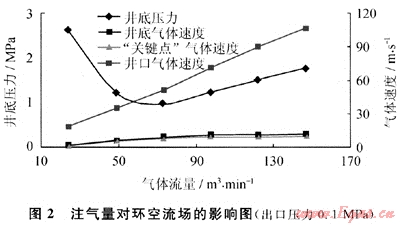 取不同注氣量對氣體鉆井環(huán)空流場進(jìn)行了數(shù)值模擬,結(jié)果表明:井底壓力隨注氣量的增加先減后增,存在一個(gè)臨界點(diǎn)(圖2)。計(jì)算條件下,注氣量從97.96m3/min增加到146.94m3/min,“關(guān)鍵點(diǎn)”、井底氣體速度僅增加4.4%和4.0%,而井口氣流速度卻增加了近5倍。所以超過一定值后,繼續(xù)增加注氣量,并不能有效提高下部井段氣流速度,從而提高下部井段井眼凈化能力,反而會導(dǎo)致上部井段沖蝕嚴(yán)重和水力能量的不必要浪費(fèi)。