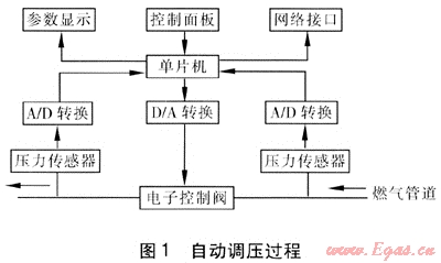 操作者通過(guò)控制中心遠(yuǎn)程或控制面板現(xiàn)場(chǎng)設(shè)定出口壓力值。在現(xiàn)場(chǎng)站點(diǎn)的入口和出口處均設(shè)有壓力傳感器,實(shí)時(shí)將入口、出口側(cè)的壓力信號(hào)經(jīng)模擬/數(shù)字信號(hào)(A/D)轉(zhuǎn)換器輸入單片機(jī),并可在液晶屏幕上實(shí)時(shí)顯示。當(dāng)出口壓力低于設(shè)定值時(shí),單片機(jī)發(fā)出的數(shù)字控制信號(hào)經(jīng)數(shù)字/模擬信號(hào)(D/A)轉(zhuǎn)換器轉(zhuǎn)換后輸出模擬電流信號(hào)至燃?xì)夥辣娮涌刂崎y,電子控制閥流量增大直至出口壓力達(dá)到設(shè)定值。當(dāng)出口壓力高于設(shè)定值時(shí),單片機(jī)發(fā)出控制信號(hào)經(jīng)數(shù)字/模擬信號(hào)(D/A)轉(zhuǎn)換器轉(zhuǎn)換后輸出模擬電流信號(hào)至燃?xì)夥辣娮涌刂崎y,電子控制閥流量減小直至出口壓力達(dá)到設(shè)定值。當(dāng)入口壓力過(guò)低或者過(guò)高、超出警戒值時(shí),系統(tǒng)可以在現(xiàn)場(chǎng)顯示報(bào)警,也可以通過(guò)網(wǎng)絡(luò)接口上報(bào)控制中心。系統(tǒng)可選用512 kb儲(chǔ)存器作為人機(jī)交互系統(tǒng)的外部?jī)?chǔ)存器,用來(lái)儲(chǔ)存設(shè)置參數(shù)等信息,這樣可以將壓力數(shù)據(jù)儲(chǔ)存并按要求進(jìn)行統(tǒng)計(jì)以供顯示或上傳調(diào)用。