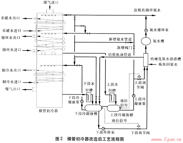 ① 在上段冷凝液泵總出口管道上增加一個(gè)閥門和循環(huán)氨水清掃管道。在冬季,將新增閥門關(guān)上,用循環(huán)氨水代替上段冷凝液對中段進(jìn)行噴灑[3],中段的冷卻熱量由循環(huán)水通過涼水架換熱帶走,初冷器上、中段下來的冷凝液經(jīng)水封槽進(jìn)入上段冷凝液槽,用上段冷凝液泵直接抽送到機(jī)械化氨水澄清槽,可以避免初冷器清掃下來的萘又重新進(jìn)入初冷器中堵塞初冷器。在其他季節(jié),將新增閥門打開,用上段冷凝液直接對中段進(jìn)行噴灑以降低煤氣溫度。