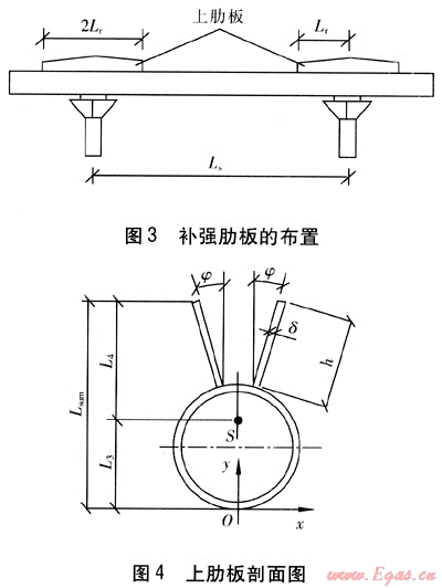 該方法通過增大管道截面系數(shù),使滑動支架跨距增加30%~60%[4],而多消耗的金屬不會超過管子重量的10%。當(dāng)滑動支架間距較長時,可以在滑動支架處管道上方加焊肋板,肋板可用扁鋼或鋼板制成,補(bǔ)強(qiáng)肋板的布置見圖3。圖中,Ls為兩個滑動支架之間的距離,單位為m;Lr為滑動支架支點距肋板最遠(yuǎn)端的距離,單位為m,取Lr=0.1Ls。上肋板剖面圖見圖4,圖中,φ為肋板與管子截面中心垂直線的夾角,單位為(°);δ為肋板厚度,單位為m;h為肋板高度,單位為m;點S為管道補(bǔ)強(qiáng)后的重心,點O為坐標(biāo)原點;L3為點S、O間距離,單位為m;L4為點S距肋板上端的垂直距離,單位為m;Lsum為L3、L4之和,單位為m。圖4中兩側(cè)肋板軸線交于點S。