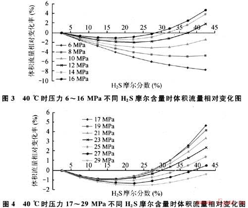 圖3、4分別給出了基于前述基準(zhǔn)條件,40℃時(shí)壓力為6~16MPa、17~29MPa和不同H2S摩爾分?jǐn)?shù)含量時(shí)體積流量相對變化情況。由圖3、4可知:在所列H2S摩爾分?jǐn)?shù)范圍內(nèi),隨著H2S含量增加,6~8MPa范圍內(nèi)體積流量變化始終負(fù)增長,呈下降趨勢;12~16MPa,17~27MPa的體積流量變化均開始負(fù)增長,后正增長;10MPa時(shí)與29MPa時(shí)類似,分別在H2S摩爾分?jǐn)?shù)為25%、20%附近時(shí)體積流量降至最低,分別降低3%和1.6%。