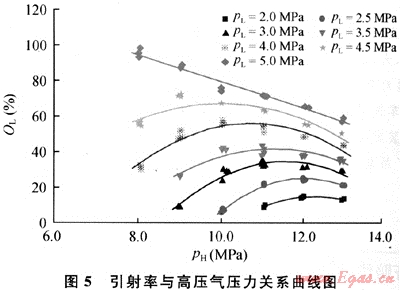 一般來說,隨著高壓氣壓力的增加,高壓氣流量增大,相應的引射量(低壓氣流量)也增大。但當聲。高于某特定值時,隨著高壓氣壓力的進一步增大,噴嘴出口的壓力升高,低壓氣的進氣壓力與噴嘴出口壓力的壓差減小,從而低壓流體的引射量減少。這表明在天然氣噴射裝置實際運行時,不能靠盲目提高高壓氣的進氣壓力來增大低壓氣流量。