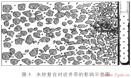 儲(chǔ)層中黏土礦物遇淡水極易膨脹和運(yùn)移,膠結(jié)變差,儲(chǔ)層易出砂。水砂復(fù)合對(duì)滲流影響劇烈。在水砂復(fù)合傷害的情況下,氣藏的絕對(duì)滲透率和氣相相對(duì)滲透率降低同時(shí)降低。如果氣井間歇關(guān)井,則近井地帶氣液兩相重新分布,從開井生產(chǎn)時(shí)的氣液兩相同流變成液相為連續(xù)相,氣相呈氣泡狀分布在地層孔隙中。對(duì)出砂地層,在近井地層和防砂管之間一定范圍內(nèi)會(huì)形成污染帶,其中地層中粉細(xì)砂及泥質(zhì)在高含水飽和度成為非牛頓流體,重新開井時(shí)需要啟動(dòng)壓力,在某些情況下會(huì)造成水淹氣藏(圖3)。