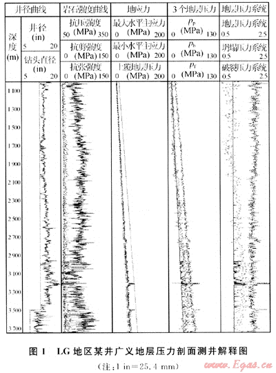 利用LG地區(qū)已鉆井的測井及實鉆資料,對某井3個壓力(孔隙壓力、坍塌壓力和破裂壓力)進行了定量計算,建立了較完整的廣義地層壓力剖面(圖1)[1~5]。