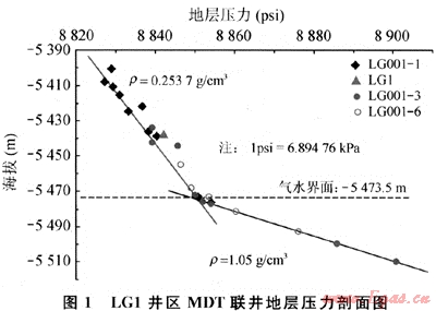 MDT在LG001-1井井深6171.19m測到1個壓力點(diǎn),測點(diǎn)處海拔-5573.78m,壓力61.2717MPa。將此海拔代入LG1井氣柱方程,計(jì)算壓力61.184MPa。用LG1井氣柱方程推算壓力比實(shí)測壓力低0.0877MPa,兩者相差較小,因此判定它們?yōu)橥粔毫ο到y(tǒng)。LG001-3井水層段測到了多點(diǎn)MDT壓力資料,與LG1、LG001-1、LG001-3井進(jìn)行多井壓力分析,分析結(jié)果表明,LG1、LG001-1、LG001-3并氣層與LG3井水層在縱向上呈較好的氣水分布規(guī)律,判定它們?yōu)橥粔毫ο到y(tǒng)。