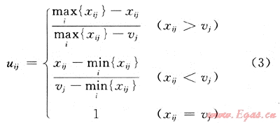 一般情況下,指標(biāo)按性質(zhì)可分為正指標(biāo)、逆指標(biāo)和中性指標(biāo)。此外,由于不同指標(biāo)之間的量綱不一樣,因而也必須對指標(biāo)數(shù)據(jù)進行無量綱化處理。根據(jù)指標(biāo)性質(zhì)分別為3種類型指標(biāo)設(shè)計了相應(yīng)的指標(biāo)處理函數(shù)。