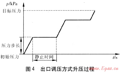 采用調(diào)壓器出口調(diào)壓方式進(jìn)行調(diào)壓時(shí),需設(shè)置的狀態(tài)參數(shù)包括壓力步長(zhǎng)、靜止時(shí)間、目標(biāo)壓力。壓力步長(zhǎng)是連續(xù)動(dòng)作的壓力變化值。靜止時(shí)間是每個(gè)壓力步長(zhǎng)動(dòng)作完成后至下一步長(zhǎng)開(kāi)始的停頓時(shí)間。目標(biāo)壓力是需升壓或降壓后達(dá)到的壓力??刂破靼丛O(shè)定的壓力步長(zhǎng)、靜止時(shí)間運(yùn)行,出口壓力傳感器將出口壓力p的信號(hào)反饋到控制器,當(dāng)p等于目標(biāo)壓力時(shí),升壓或降壓停止。圖4為采用出口調(diào)壓方式進(jìn)行升壓的過(guò)程。