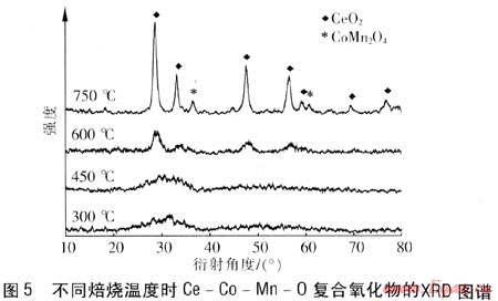 圖5為不同焙燒溫度時Ce-Co-Mn-O復(fù)合氧化物的XRD圖譜。焙燒溫度≤450℃時,樣品的衍射峰十分彌散,晶體為無定形態(tài);在600℃焙燒后,位于28.56°、33.08°、47.48°及56.33°處出現(xiàn)了微弱的CeO2衍射峰(JCPDS No.34-0394),但未觀察到尖晶石相衍射峰。隨著焙燒溫度進一步升高到750℃,結(jié)晶度增加,CeO2衍射峰不斷銳化和增強,并在59.09°、69.40°及76.70°等高角度也出現(xiàn)了衍射峰。需要強調(diào)的是,焙燒溫度在750℃時,樣品中在36.19°及62.26°出現(xiàn)了尖晶石相CoMn2O4的衍射峰(JCPDS No.01-1126),而該尖晶石相的形成將顯著降低催化劑的活性,不利于NO2的生成,這與圖4所示結(jié)果相符。