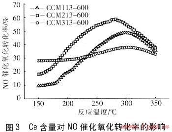 針對NO催化氧化的重要性,國內(nèi)外學者開展了積極的研究,其中以貴金屬Pt、Pd催化劑的轉(zhuǎn)化效率較高,300℃時轉(zhuǎn)化率接近90%[7~9]。我國貴金屬資源相對匱乏且造價高昂,主要用于汽車尾氣處理,而大型煙氣處理裝置則難以實現(xiàn)。近年來,以過渡金屬為活性主體的新型催化劑引起了國內(nèi)外學者的重視,并進行了大量研究[10~12]。我國的稀土儲量位居世界第一,將各類稀土元素應(yīng)用于催化領(lǐng)域已有大量報道,其中以La、Ce應(yīng)用較多。以CeO2為例,由于其強大的儲存和釋放氧的能力,已被應(yīng)用到多個催化方向(如CO催化氧化)[13]。