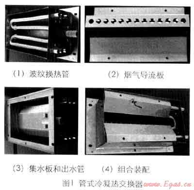 所研發(fā)的不銹鋼波紋管冷凝式熱交換器用于配置天然氣的12l/min冷凝式熱水器。熱交換器由波紋換熱管、煙氣導(dǎo)流板、冷凝水集水板、殼體和封蓋板等組成(圖1)。換熱管采取3管路4回程形式,管程之間有叉角,結(jié)構(gòu)緊湊,強化傳熱效果良好。結(jié)構(gòu)上將集氣罩和冷凝熱交換器設(shè)計成一個整體減少了空間體積同時外觀整體感強。