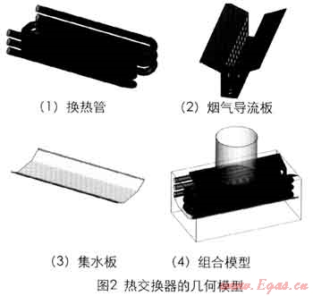 熱交換器的幾何模型如圖2。利用Gambit創(chuàng)建三維物理模型并劃分網(wǎng)格。排煙管的對稱結(jié)構(gòu)相對簡單,其中的氣流變化較緩慢,網(wǎng)格參數(shù)的間距尺寸取為0.005mm;其余部分的網(wǎng)格參數(shù)的間距尺寸城小為0.002mm。總共約劃分7917萬個網(wǎng)格。