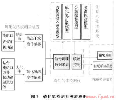 計算機(jī)軟件系統(tǒng)主要針對現(xiàn)場生產(chǎn)數(shù)據(jù),基于氣液兩相流理論建立井筒硫化氫侵入速度模型,用CFD軟件建立當(dāng)前風(fēng)向和風(fēng)速下硫化氫易溢出部位的擴(kuò)散分布模型,結(jié)合多測點硫化氫和硫離子的實時測量數(shù)據(jù),重點建立各測點之間信號變化的關(guān)聯(lián)分析,以及測點的歷史數(shù)據(jù)和當(dāng)前數(shù)據(jù)的概率密度分析甄別,確定當(dāng)前硫化氫的溢出情況,給出合理建議,并在關(guān)鍵時刻發(fā)出報警信號,自動啟動重點區(qū)域噴淋裝置工作,以降低消減漏點位置硫化氫的濃度,保護(hù)重點區(qū)域工作人員安全,為安全生產(chǎn)提供保障。檢測系統(tǒng)流程結(jié)構(gòu)如圖7所示。