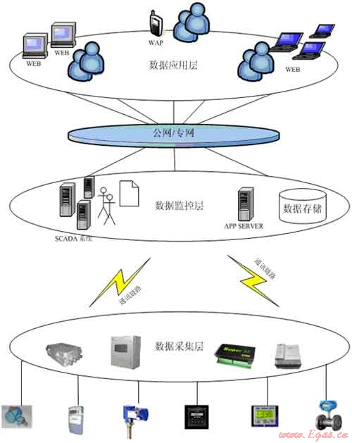 通用SCADA系統(tǒng)可分為3層。第1層為數(shù)據(jù)采集層,由RTU與一次儀表構(gòu)成,完成現(xiàn)場原始數(shù)據(jù)的采集與預處理。根據(jù)設(shè)計需求還可以實現(xiàn)現(xiàn)場的數(shù)據(jù)存儲,以保證通訊中斷后數(shù)據(jù)的連續(xù)性;第2層為數(shù)據(jù)監(jiān)控層。在這層將利用各種軟件遠程仿真現(xiàn)場,實現(xiàn)數(shù)據(jù)的實時監(jiān)控、實時報警。該層可根據(jù)對應的管理模式再分為分控中心、總控中心等,還可根據(jù)設(shè)計需求進行大量歷史數(shù)據(jù)的存儲;第3層為數(shù)據(jù)應用層。在應用層實現(xiàn)對已采集數(shù)據(jù)的分析、整理,并根據(jù)需要實現(xiàn)多種形式的發(fā)布。業(yè)界很多公司分別在數(shù)據(jù)采集層、數(shù)據(jù)監(jiān)控層、數(shù)據(jù)應用層都擁有極其穩(wěn)定的產(chǎn)品和豐富的系統(tǒng)集成經(jīng)驗。
