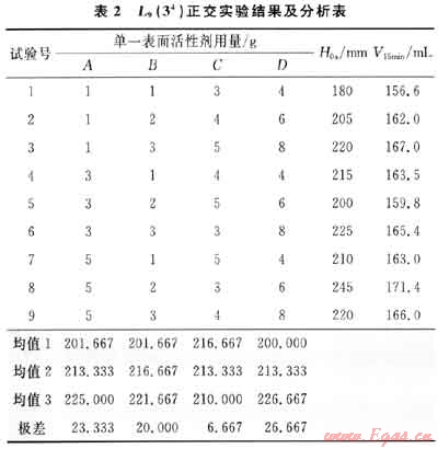 為進(jìn)一步研究單一表面活性劑之間的復(fù)配效果,找出最佳的優(yōu)化配比,選擇單一表面活性劑起泡能力和攜液能力較好的L-1(A)、甜菜堿(B)、銨鹽(C)和L-2(D)進(jìn)行優(yōu)化實(shí)驗(yàn)。在優(yōu)化實(shí)驗(yàn)中,采用正交設(shè)計(jì)實(shí)驗(yàn)方法,選取4因素3水平,正交表L9(34)對(duì)實(shí)驗(yàn)方案進(jìn)行優(yōu)化研究,然后采用直觀分析法對(duì)測(cè)定的數(shù)據(jù)進(jìn)行處理,可得到LYB-1型泡排劑的最佳配比,實(shí)驗(yàn)結(jié)果見表2。實(shí)驗(yàn)泡排劑溶液濃度為0.5%,總液體量為200mL,地層水礦化度為4.7×104mg/L,水型為CaCl2型,試驗(yàn)溫度為30℃。