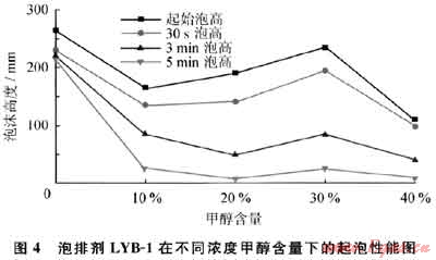 為了充分說明泡排劑LYB-1具有較強(qiáng)的抗甲醇能力,30℃時(shí)將該泡排劑與現(xiàn)場(chǎng)應(yīng)用較多的泡排劑UT-118、HY-5G和HY-3G進(jìn)行了對(duì)比,試驗(yàn)結(jié)果見表3。表3數(shù)據(jù)表明,泡排劑LYB-1具有較強(qiáng)的抗甲醇能力,明顯優(yōu)于其他3種泡排劑。