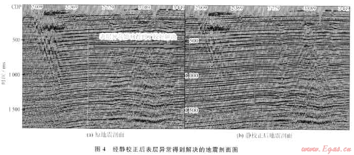 三湖地區(qū)地表相對平坦,以往該區(qū)資料處理采用高程靜校正,導致在很多近地表異常地區(qū)地面資料較差。通過近兩年的研究,認識到該區(qū)的速帶變化劇烈,存在較多的局部低降速帶異常。對靜校正方法的分析,最終確定了適合本區(qū)法——折射靜校正方法。基于模型約束的折射靜方法能提供高質量的中、長波長分量,同時,其短靜校正精度也較高。在實際靜校正工作中,主要了以下技術要點:①通過詳細的近地表結構的整剖,準確建立近地表模型,為折射靜校正提供了合模型約束參數(shù);②通過對湖區(qū)、鹽堿地、鹽堿沼澤層含氣區(qū)等表層結構對大炮初至質量影響較大區(qū),采用處理手段提高初至質量,提高了折射靜枝這些區(qū)域的應用精度;③通過提高折射波的識別、的折射分層、消除排列邊界效應的延遲時延拓,劉析反演模型,確定合理的靜校正計算標志層,最大地解決了該區(qū)存在的靜校正問題,消除了一些表常的影響(圖4)。