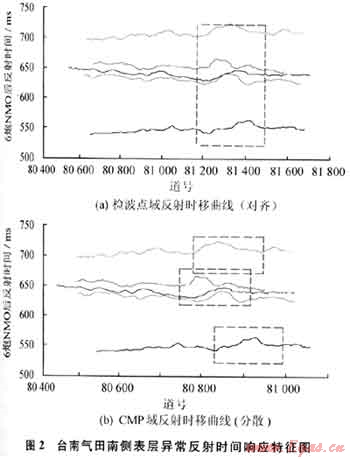 研究結果表明,不同位置單炮對于某一反射界面,表層異常和地下含氣異常的反射時間響應在檢波點域和CMP域是正好相反的。在檢波點域里,表層異常導致的反射時移是對齊的,在CMP域里是分散的;對于地下含氣異常,在檢波點域里,含氣異常導致的反射時移是分散的,在CMP域里是對齊的。實際資料應用表明(圖2),利用反射時間法識別表層異常與含氣異常是可行的,從而為甄別該區(qū)域的表層結構異常提供了一種新的思路和方法。