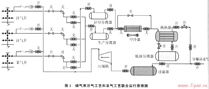 上游天然氣在分輸站調(diào)壓、計(jì)量后輸至儲(chǔ)氣庫(kù)集注站。進(jìn)站天然氣經(jīng)過(guò)濾器除去粉塵和雜質(zhì),經(jīng)壓縮機(jī)組增壓至13.O0~30.OOMPa,冷卻至溫度低于70℃后通過(guò)注氣匯管輸至井場(chǎng)注氣閥組,單井計(jì)量后再注入儲(chǔ)氣庫(kù)氣藏[1]