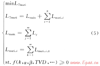 根據(jù)不同的主井眼類型選用不同的井深計(jì)算方法和限制條件[9],聯(lián)合不同的分支井眼井深計(jì)算和限制條件就可以組合為分支水平井軌道優(yōu)化的數(shù)學(xué)模型,由此能夠建立出目標(biāo)函數(shù)[10]——使得整個(gè)軌道長度為最小。分支水平井設(shè)計(jì)優(yōu)化模型為: