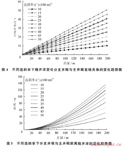 2) 隨著井深、造斜率的增加,分支井眼與主井眼的直線夾角呈正比關(guān)系,且分支井眼偏離主井眼的距離是逐漸增大的;在一定直線夾角情況下,造斜率與井深則呈反比關(guān)系。