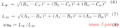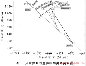 式中AN、AE、AH、BN、BE、BH、CN、CE、CH分別表示A、B、C點(diǎn)在三維空間坐標(biāo)系內(nèi)的坐標(biāo);LBC表示B點(diǎn)到C點(diǎn)的長度;L徹表示A點(diǎn)到8點(diǎn)的長度;a表示分支井眼的側(cè)鉆點(diǎn)與分支井眼終點(diǎn)的連線與主井眼的直線夾角。