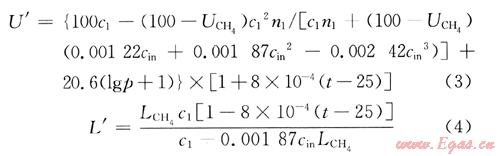 式中U′為特定溫度、壓力和組分下的爆炸上限,%;c1為氣相中甲烷的摩爾分數(shù),且有cin=1-c1;以,為氧氣與單位摩爾的甲烷發(fā)生燃燒反應時的摩爾數(shù);L′為特定溫度、壓力和組分下的爆炸下限,%。