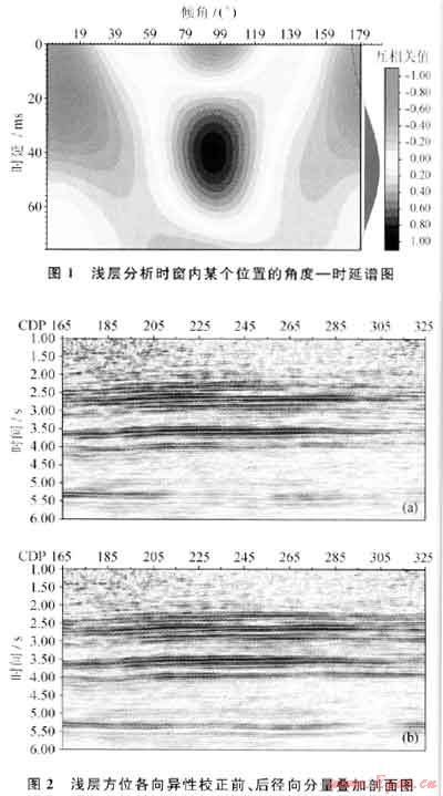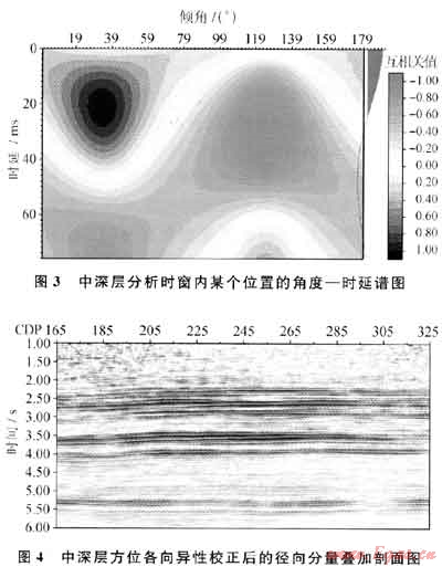 圖1為淺層分析時窗內(nèi)某個CDP位置的角度一時延圖,從圖1中可以看出,該位置的各向異性方向約90°(即東西方向),快慢橫波時差超過40ms,表明淺層各向異性特征明顯。圖2是淺層方位各向異性校正前后的徑向分量疊加剖面對比,從圖2中可以看出,經(jīng)過方位各向異性校正后的剖面的連續(xù)性得到了較大的提高,有效反射得到了加強(qiáng),成像質(zhì)量得到了明顯的改善。與此同時,淺層分析時窗以下的徑向分量數(shù)據(jù)的能量也發(fā)生了變化,說明各向異性具有“傳遞”作用,上層的各向異性會影響下層。
