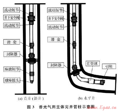 針對(duì)氣田硫化氫分壓高、生產(chǎn)井段長(zhǎng)及儲(chǔ)層非均質(zhì)性強(qiáng)的特點(diǎn),模擬普光氣田的工況條件,進(jìn)行不同材質(zhì)腐蝕評(píng)價(jià)實(shí)驗(yàn),優(yōu)化設(shè)計(jì)配套了生產(chǎn)完井一體化管柱(圖3),進(jìn)行雙向雙效、多級(jí)壓力延時(shí)起爆技術(shù)攻關(guān),開(kāi)展抗硫耐溫酸液體系、多級(jí)注入+閉合酸壓及暫堵工藝研究,有效地改造了Ⅱ、Ⅲ類(lèi)儲(chǔ)層,提高了氣藏的動(dòng)用程度和單井產(chǎn)能[8]。