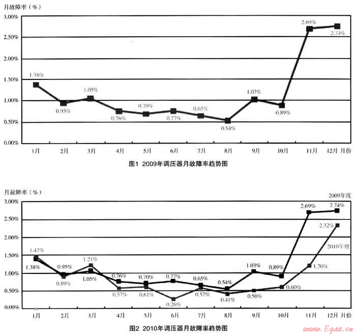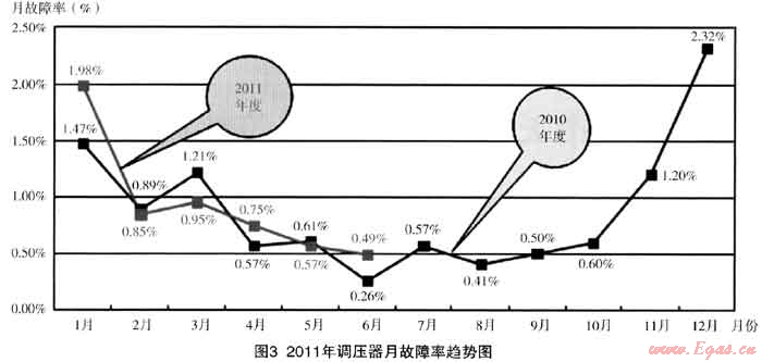 以下是2009年~2011年6月調(diào)壓器故障率的統(tǒng)計數(shù)據(jù):(如圖1~圖3)西安因冬季采暖鍋爐客戶較多,每年用氣波峰比為4:1,冬季由于上游的原因,經(jīng)常出現(xiàn)供不應求的現(xiàn)象,中壓管網(wǎng)的供氣壓力和流量達不到設計要求,處于低壓高流速的運行狀態(tài),管道內(nèi)的粉塵會被帶到下游,對調(diào)壓器的正常運行帶來一定的影響。故公司在設定調(diào)壓器故障率KPI指標時,對冬季高峰供氣期間與平時有所不同,即每年4月~10月調(diào)壓器故障率不大于1.5%,11月~次年3月調(diào)壓器故障率不大于3%。