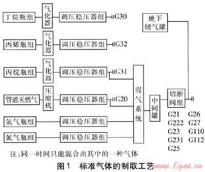 圖1中,G30、G32和G31這3種標(biāo)準(zhǔn)氣體分別經(jīng)氣化器和調(diào)壓穩(wěn)壓器組氣化、調(diào)壓穩(wěn)壓后,作為標(biāo)準(zhǔn)氣體直接使用;G20是由管道天然氣升壓、調(diào)壓穩(wěn)壓后作為標(biāo)準(zhǔn)氣體直接使用;其余9種標(biāo)準(zhǔn)氣體由氫氣、氮?dú)?、管道天然氣和丙?種基礎(chǔ)氣源按比例在混合器中混合而成,其中的氫氣、氮?dú)饨?jīng)調(diào)壓后使用。
