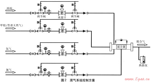 對(duì)于上述標(biāo)準(zhǔn)氣體,除組成外,更關(guān)心的是熱值,故在混合器出口設(shè)置熱值儀來(lái)檢測(cè)制取的標(biāo)準(zhǔn)氣體的熱值[5]。同時(shí)將檢測(cè)到的熱值反饋至控制系統(tǒng),對(duì)混氣比例進(jìn)行微調(diào),使整個(gè)控制系統(tǒng)成為閉環(huán)系統(tǒng)。