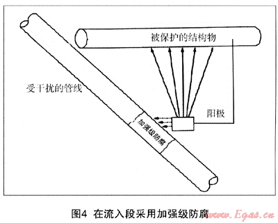 對(duì)于雜散電流腐蝕的防護(hù),人們有個(gè)誤區(qū),往往會(huì)在流出段采用加強(qiáng)級(jí)防腐,因?yàn)檫@里的管道正在被腐蝕。這樣做的結(jié)果只是腐蝕區(qū)域的前后轉(zhuǎn)移,而無法避免腐蝕的發(fā)生,因?yàn)榱魅氲碾娏骺偸且鞒龅摹?duì)于舊管道維修,由于通常只修補(bǔ)大的破損點(diǎn),使得腐蝕電流更集中在未修補(bǔ)的小破損點(diǎn)處,形成“大陰極小陽極”的嚴(yán)重腐蝕局面,反而加快了穿孔的速度。正確的做法是,要在流入段(靠近其他被保護(hù)構(gòu)筑物的輔助地床處)采用加強(qiáng)級(jí)防腐,盡力避免雜散電流的流入(圖4)。